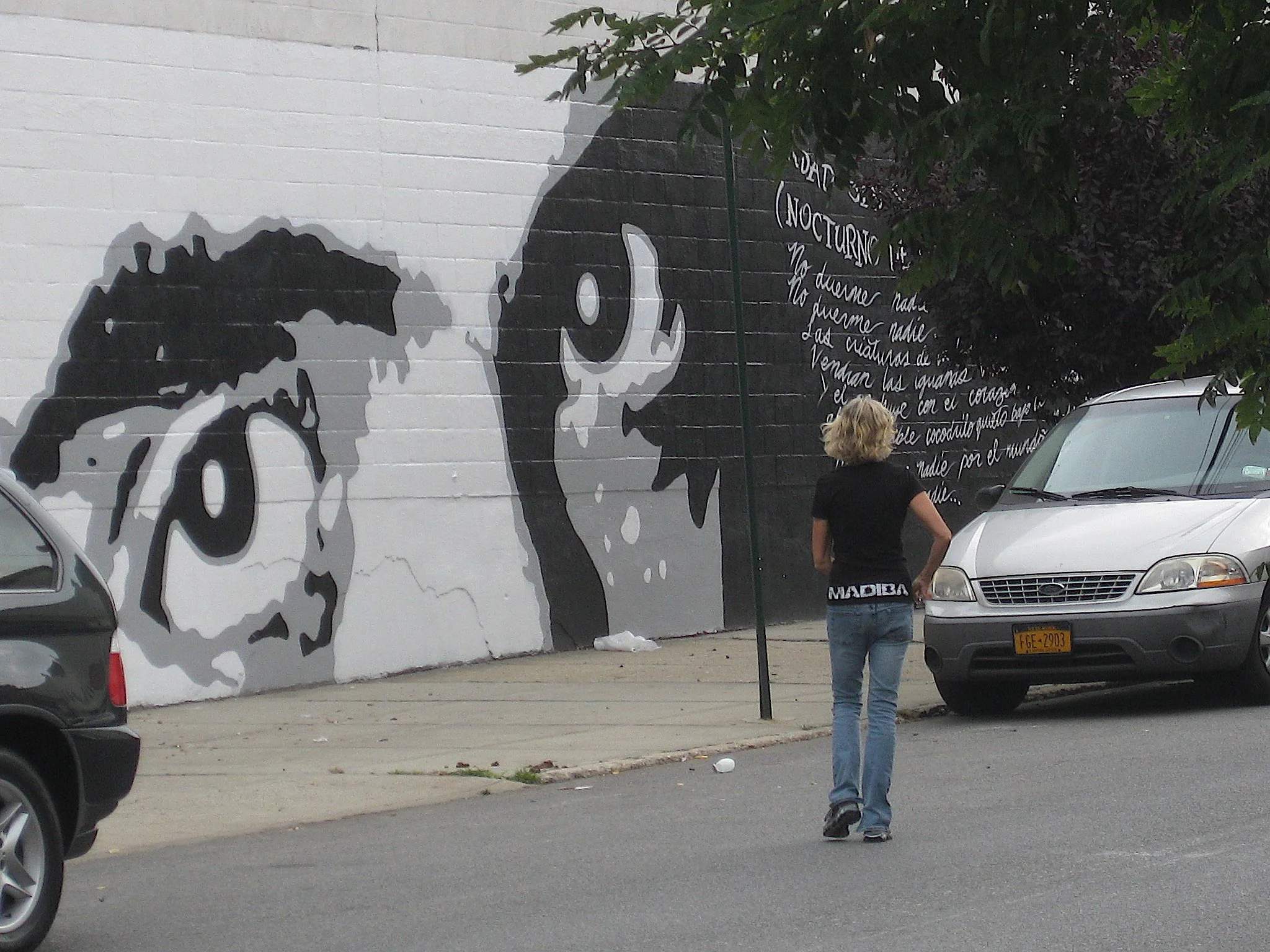 This is the first of four Federico García Lorca Murals — a three-year project begun in 2011 to celebrate the multiculturalism of the people of Bushwick, Brooklyn, a neighborhood primarily inhabited by people of Latino heritage as well as young emerging artists. The murals were inspired by the poem Sleepless City / Brooklyn Bridge Nocturne by Spanish poet and dramatist Federico García Lorca (1898-1936). Each mural includes a stanza from Lorca’s poem, in both Spanish and English translations, as well as a feature of the poet’s face — in this mural, his eyes.